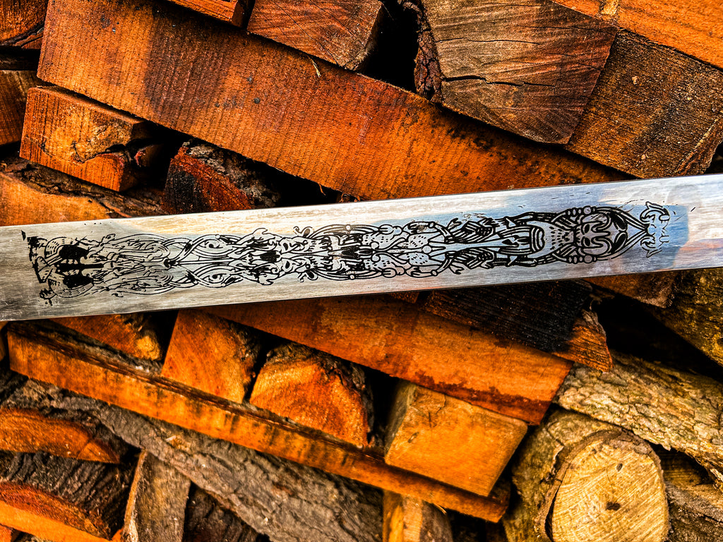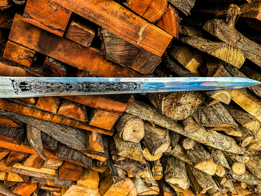 The full-length double edge sword features ornate etching on both sides of the blade, reflecting ancient Norse artistry and giving this sword a truly regal finish.