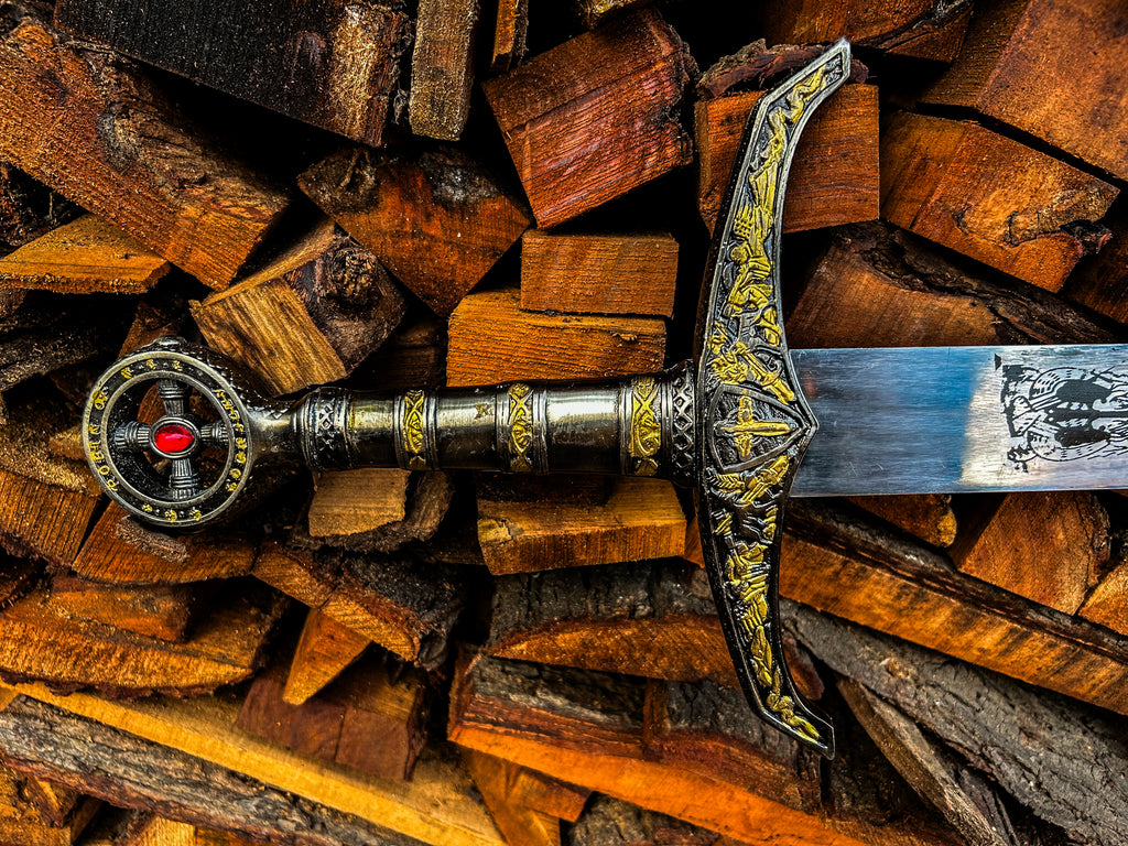 The antique-style hilt features a gold-accented crossguard and pommel with traditional Vikings sword motifs, providing both protection and flair. A blood-red gem in the pommel enhances the sword’s commanding presence.