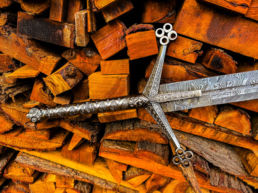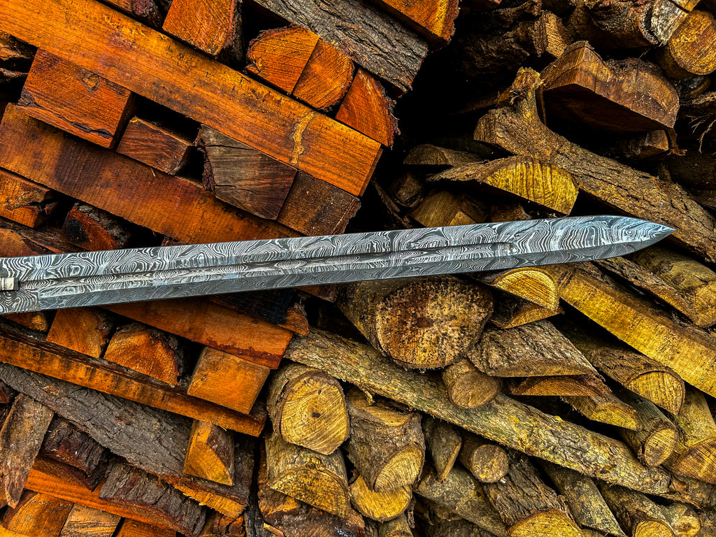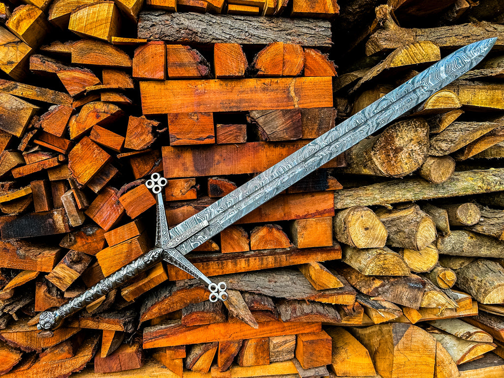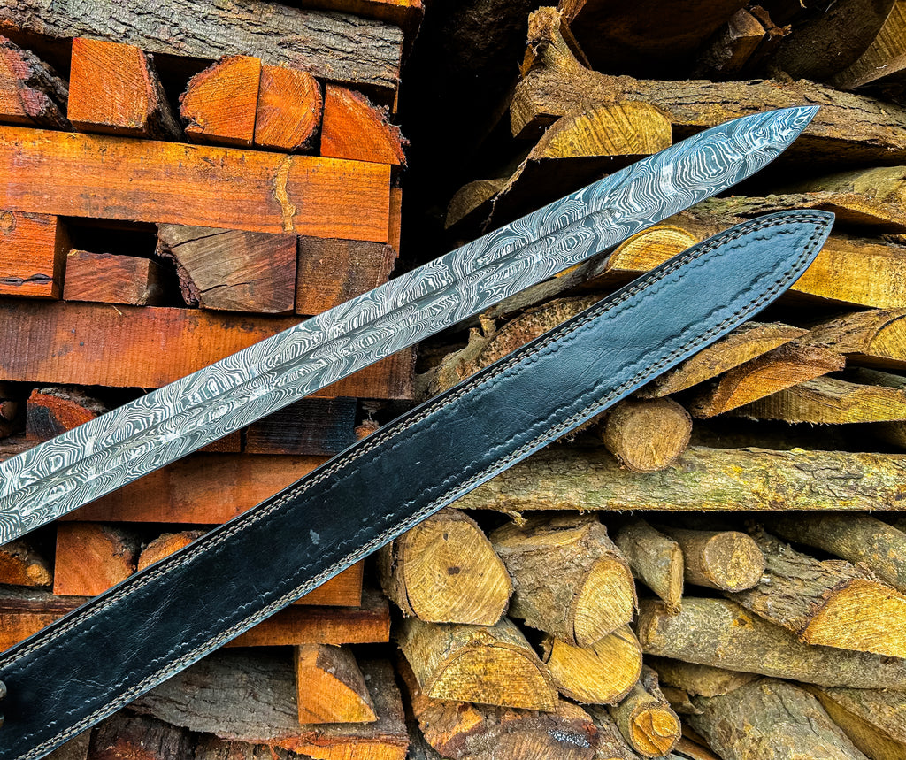 This Damascus Claymore is a true longsword, forged with a double-edged sword design that ensures both beauty and battle-ready functionality. With its imposing size and intricate hand-forged detailing, it belongs among the finest long swords and Damascus steel swords available today.