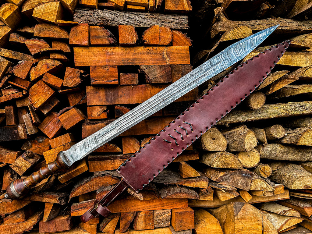 The deep brown, hand-laced sheath is stitched with strength and style in mind. This Damascus steel longsword pairs beautifully with its rugged sheath, providing both protection and presentation.
