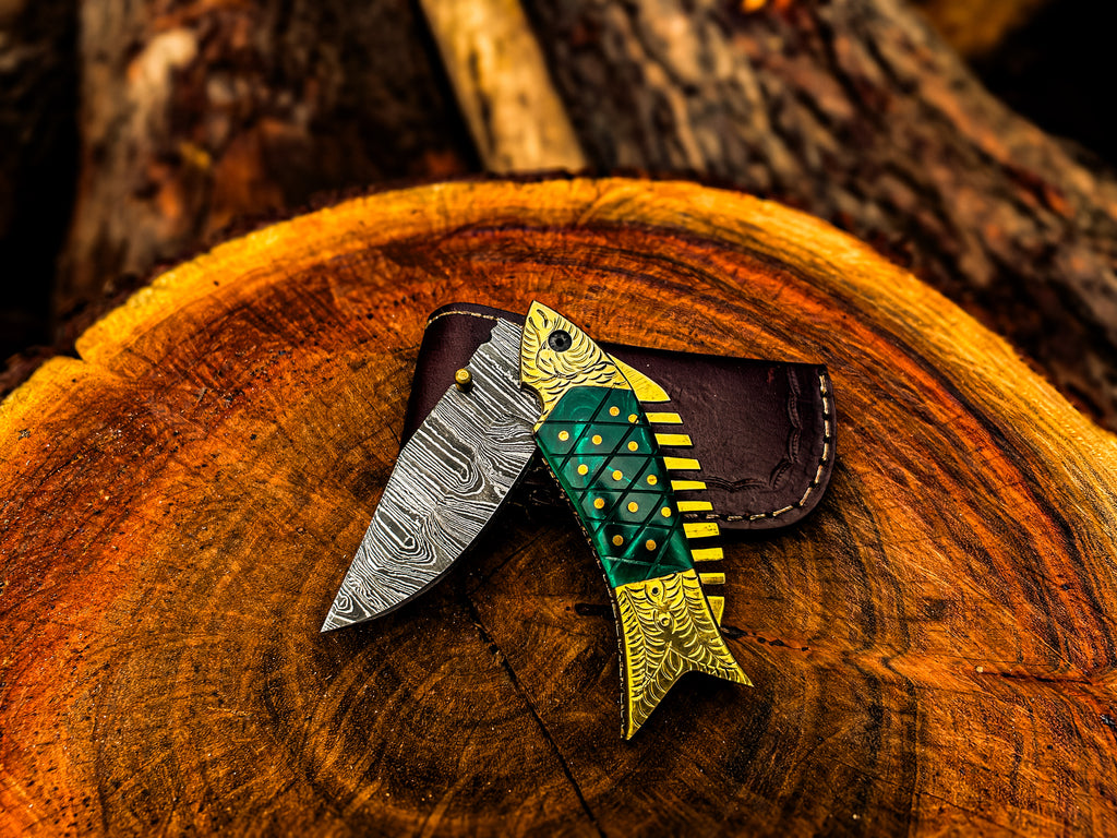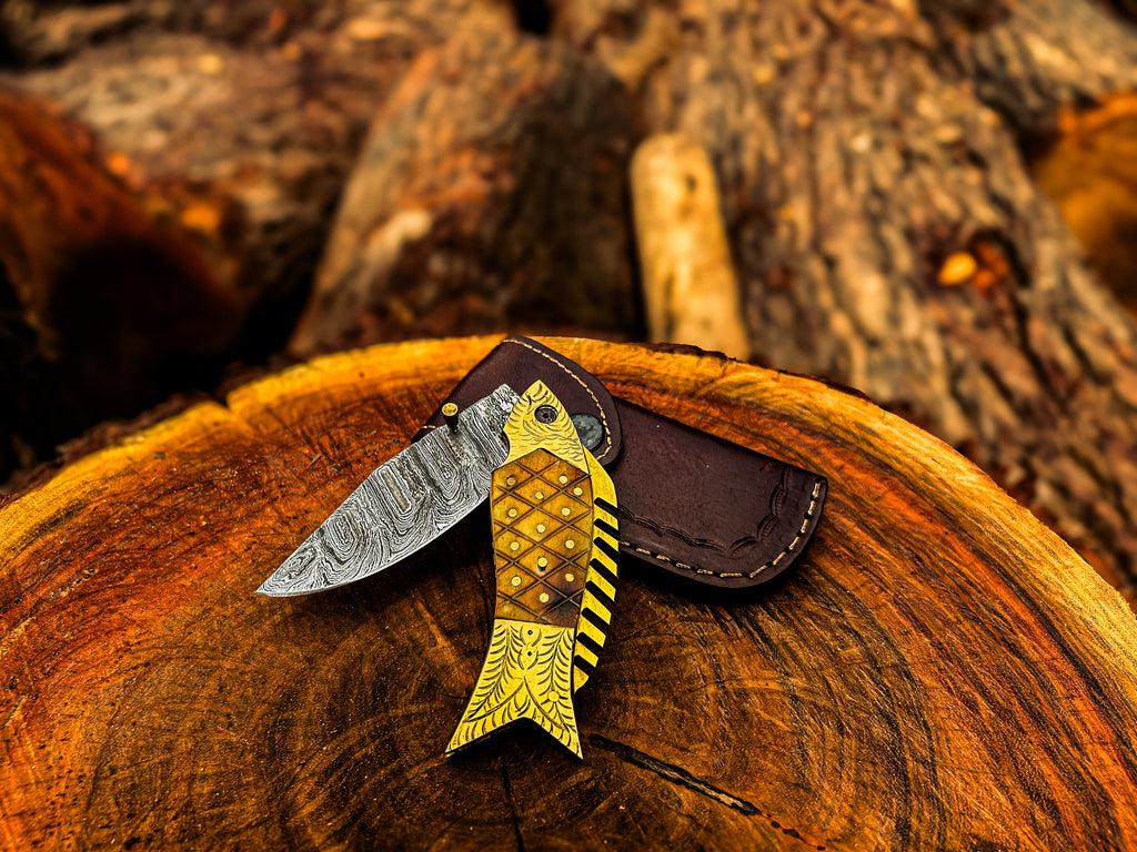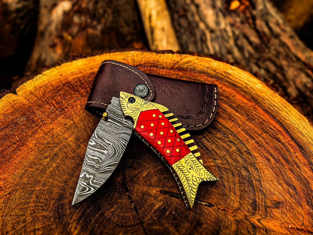 Handmade Fish Shaped Damascus Steel Folding Knife – Collectible Pocket Knives with Leather Sheath